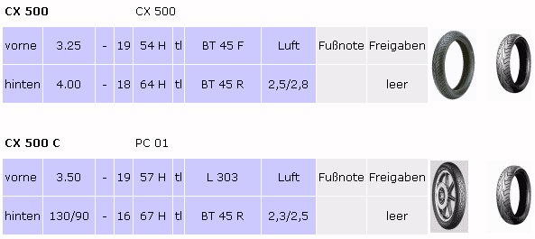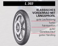 Die Eintragung des Bridgestone Battlax BT 45 mit der metrischen Größe 100/90 für vorne kann man sich seit Ende 2005 schenken, da es seit dieser Zeit den L 303 mit der "alten", zölligen Größe (3,50-19) wieder gibt.
